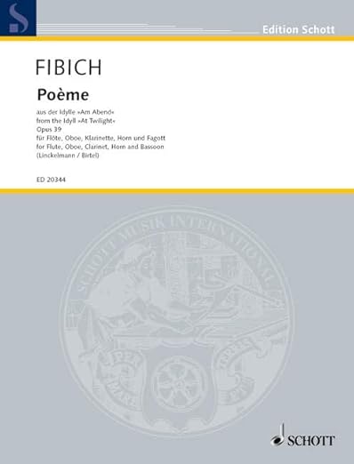 Flute, oboe, clarinet, horn, and bassoon. Bohemian composer Zdenek Fibich (1850-1900), now in the shadow of Smetana and Dvorák, was instrumental in the foundation of the Czech national school. His best-known work is this theme from his symphonic poem At Twilight. In 1908 violinist Jan Kubelik titled this melody Poème, which has become one of the most popular of classical themes. In spite of a relatively short life, Fibich is primarily recognized for a large body of piano literature from which this popular melody was taken. This transcription brings to light the warm, resonant timbres of each instrument in a setting that connects lyrical fragments into a pleasing, expressive whole. Written in concert D flat, the setting highlights the lyrical capabilities of each quintet member within a limited instrumental range.--The Instrumentalist